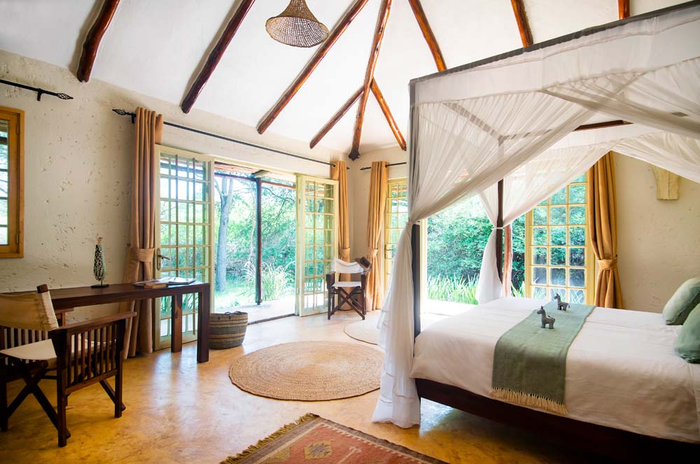 Lake Duluti Lodge has eighteen chalets, each over 140 square meters with a bedroom, small lounge, full en suite bathroom, and terrace with views of the nature bushes.